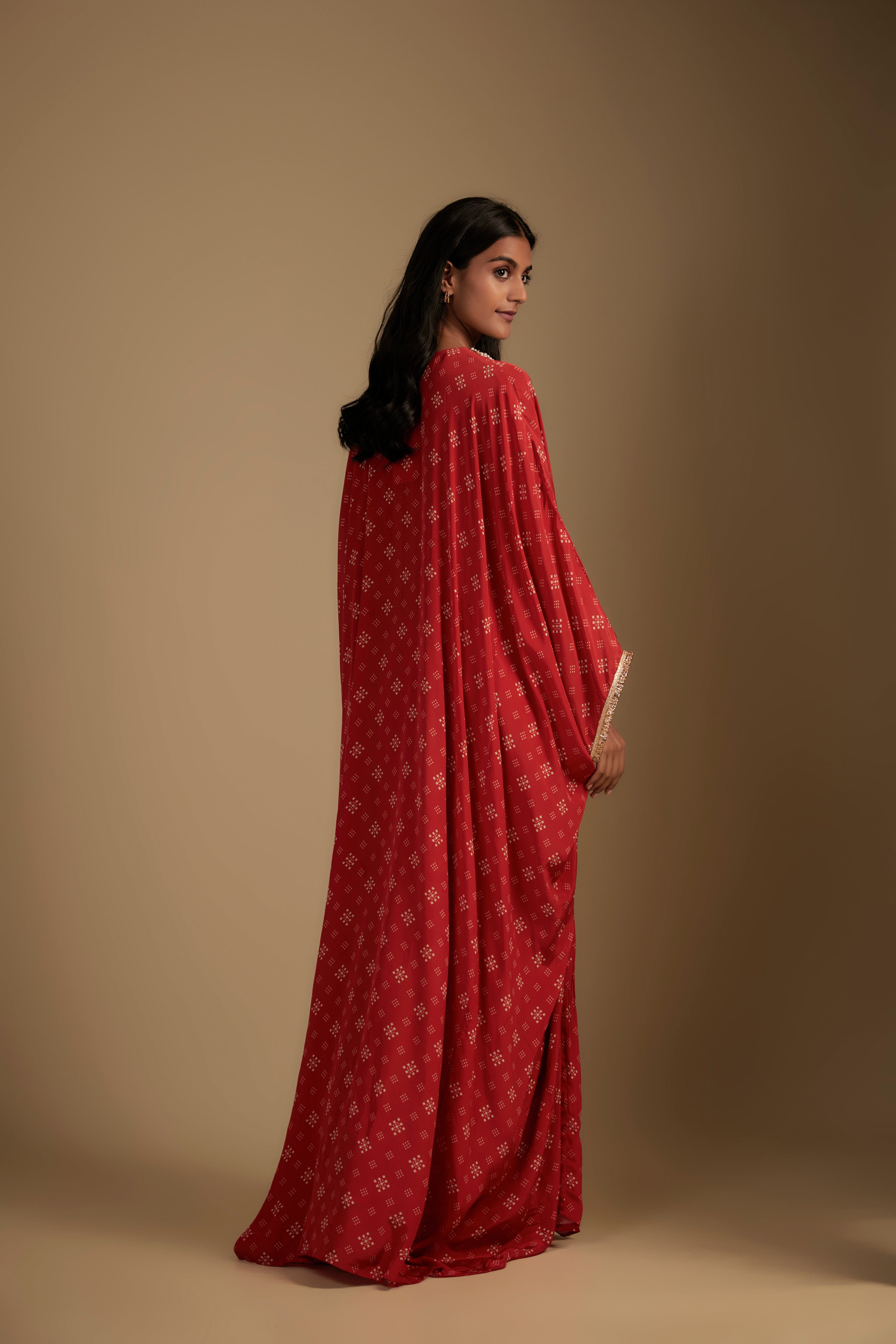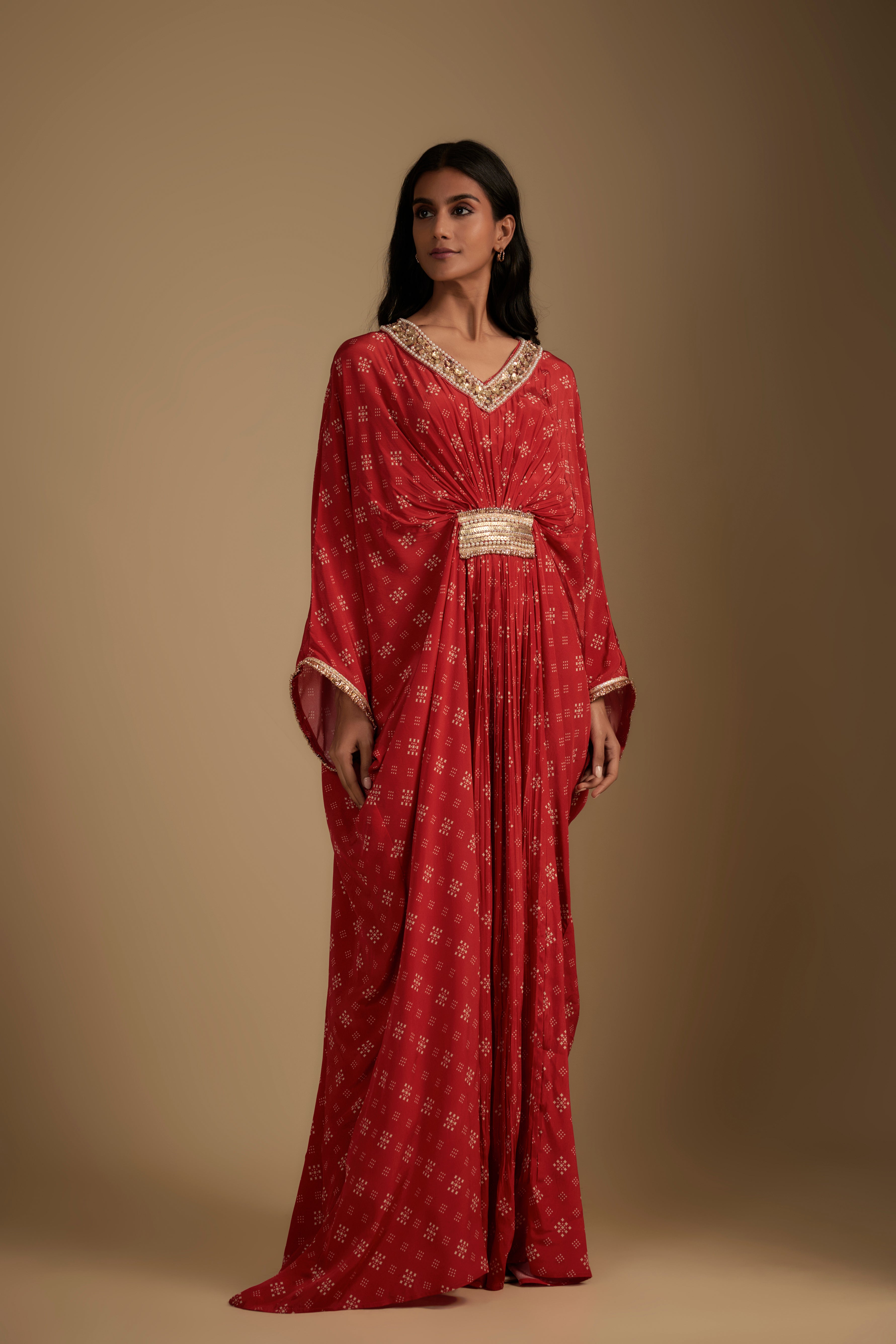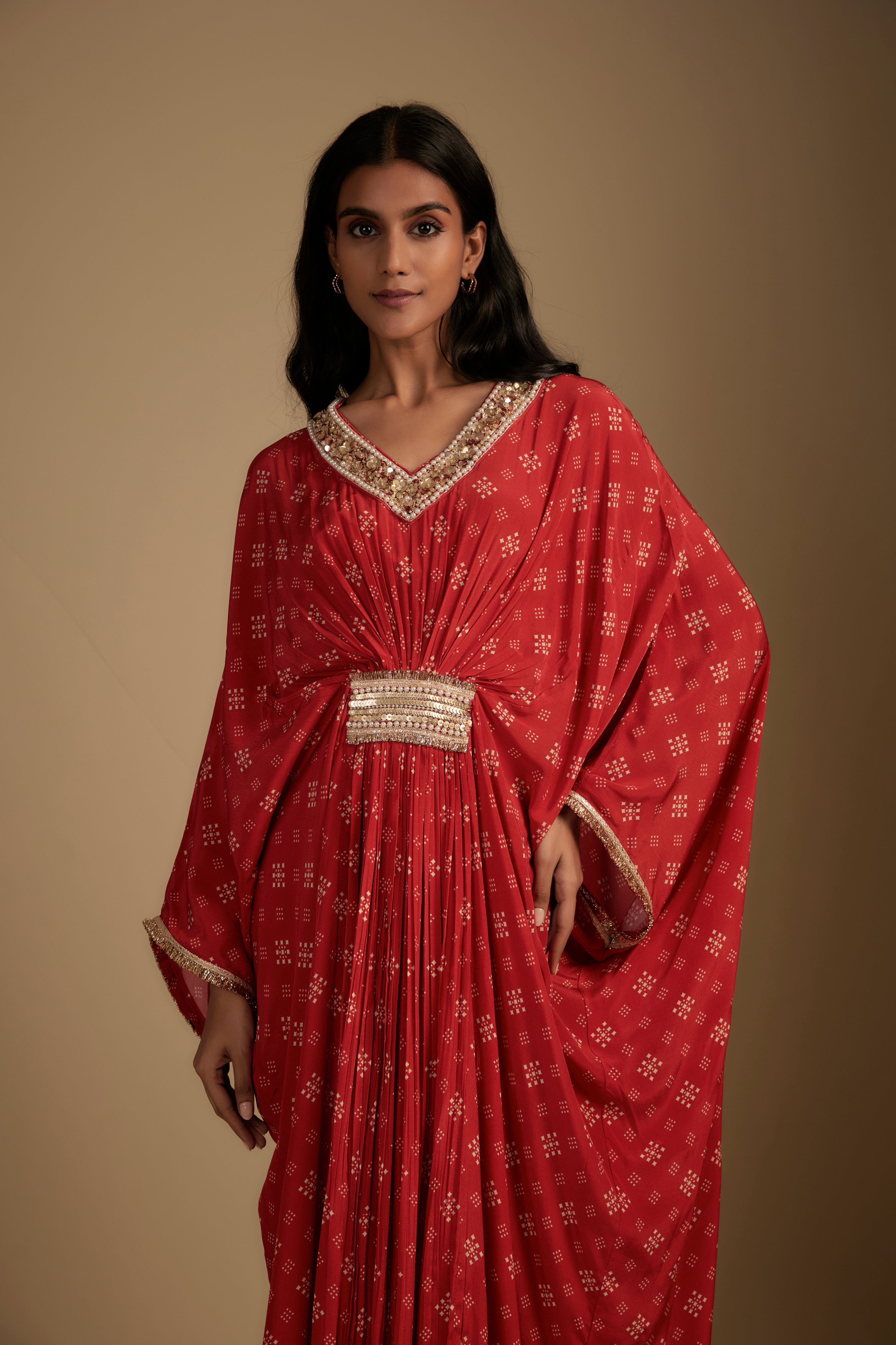 Featuring a red printed kaftan in crepe fabric with sequins and pearl work