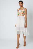 Featuring a white halter jacket in linen cotton and chanderi base with dori, velvet, and sequins embroidery. This contains only one piece.
