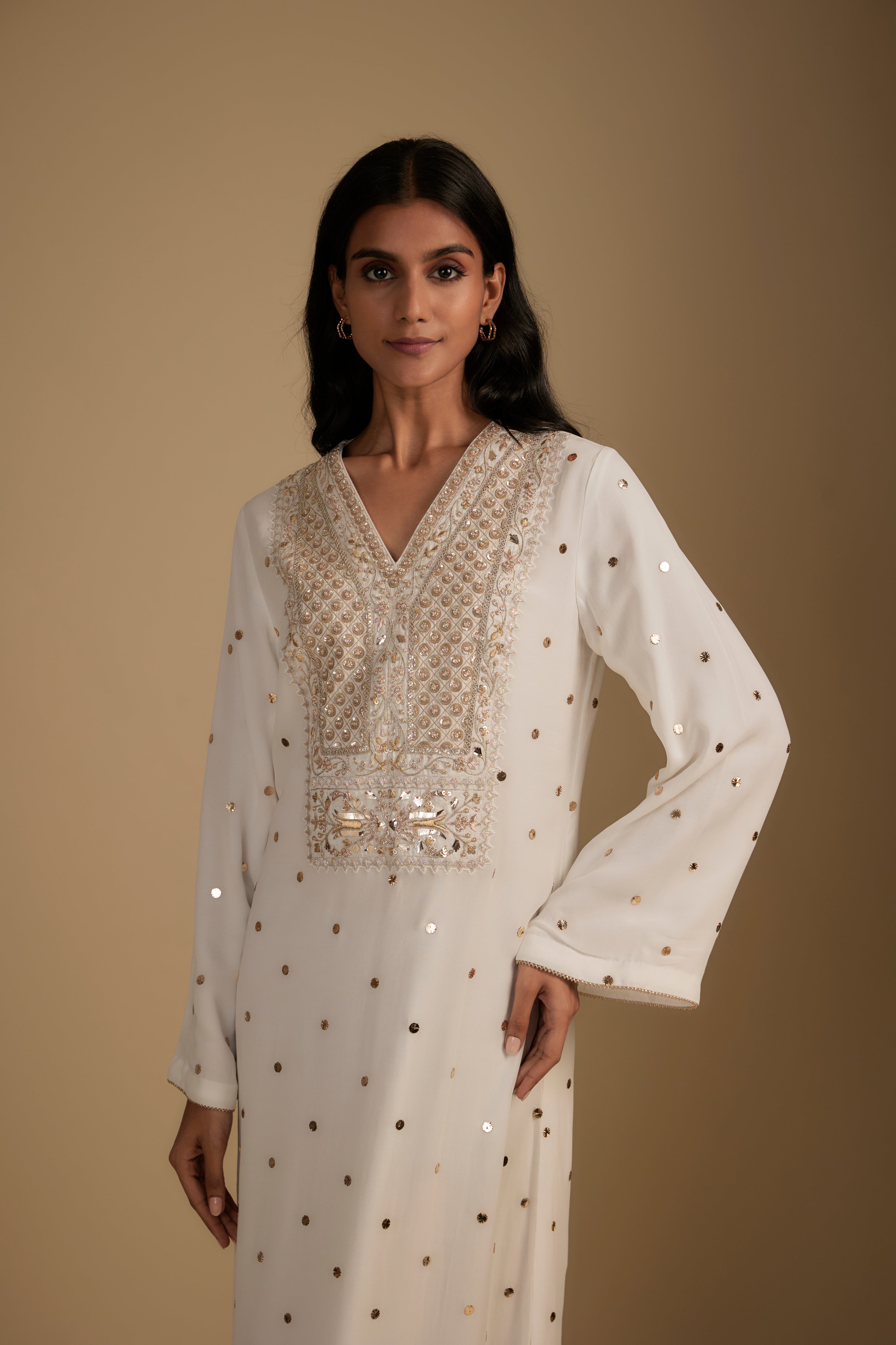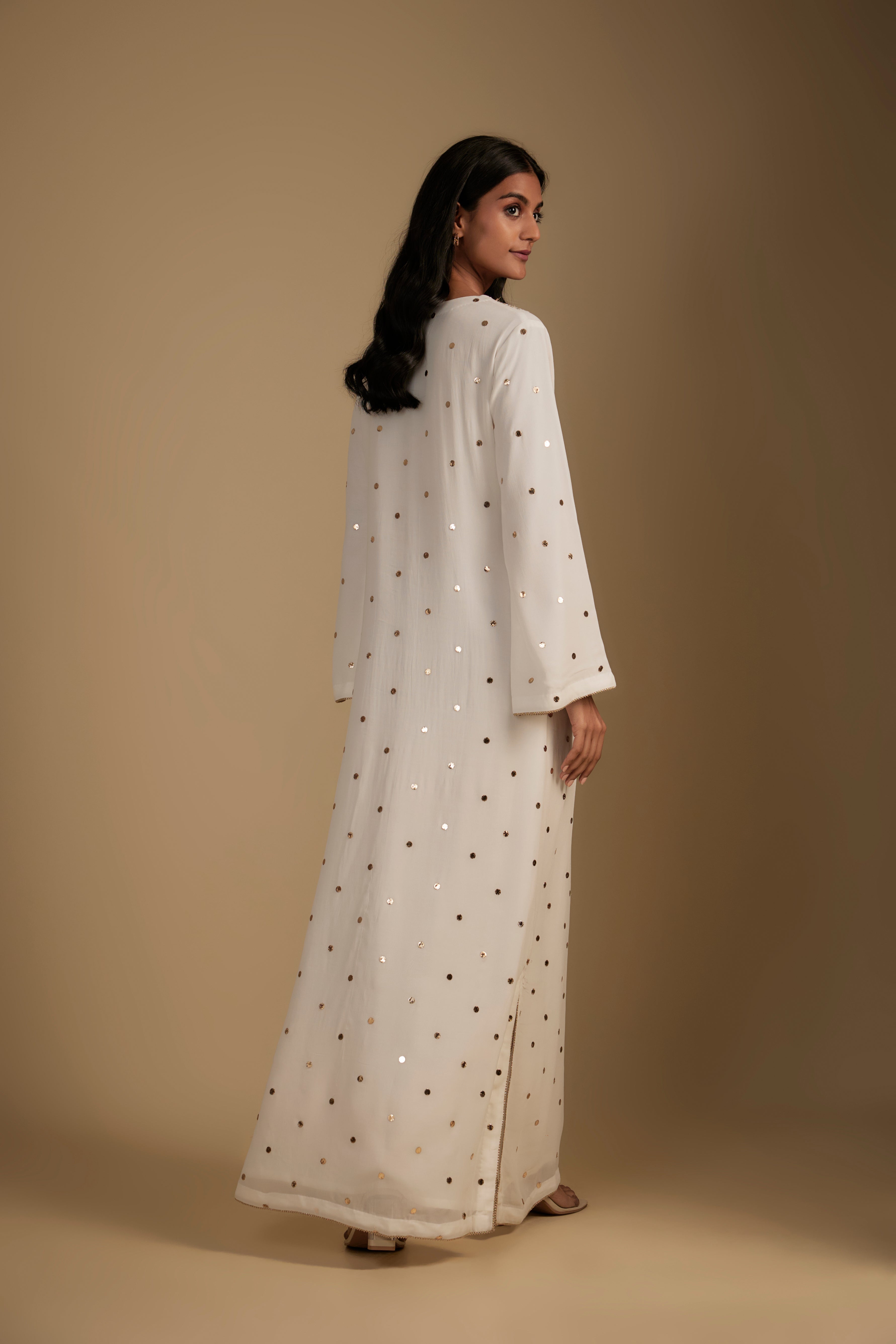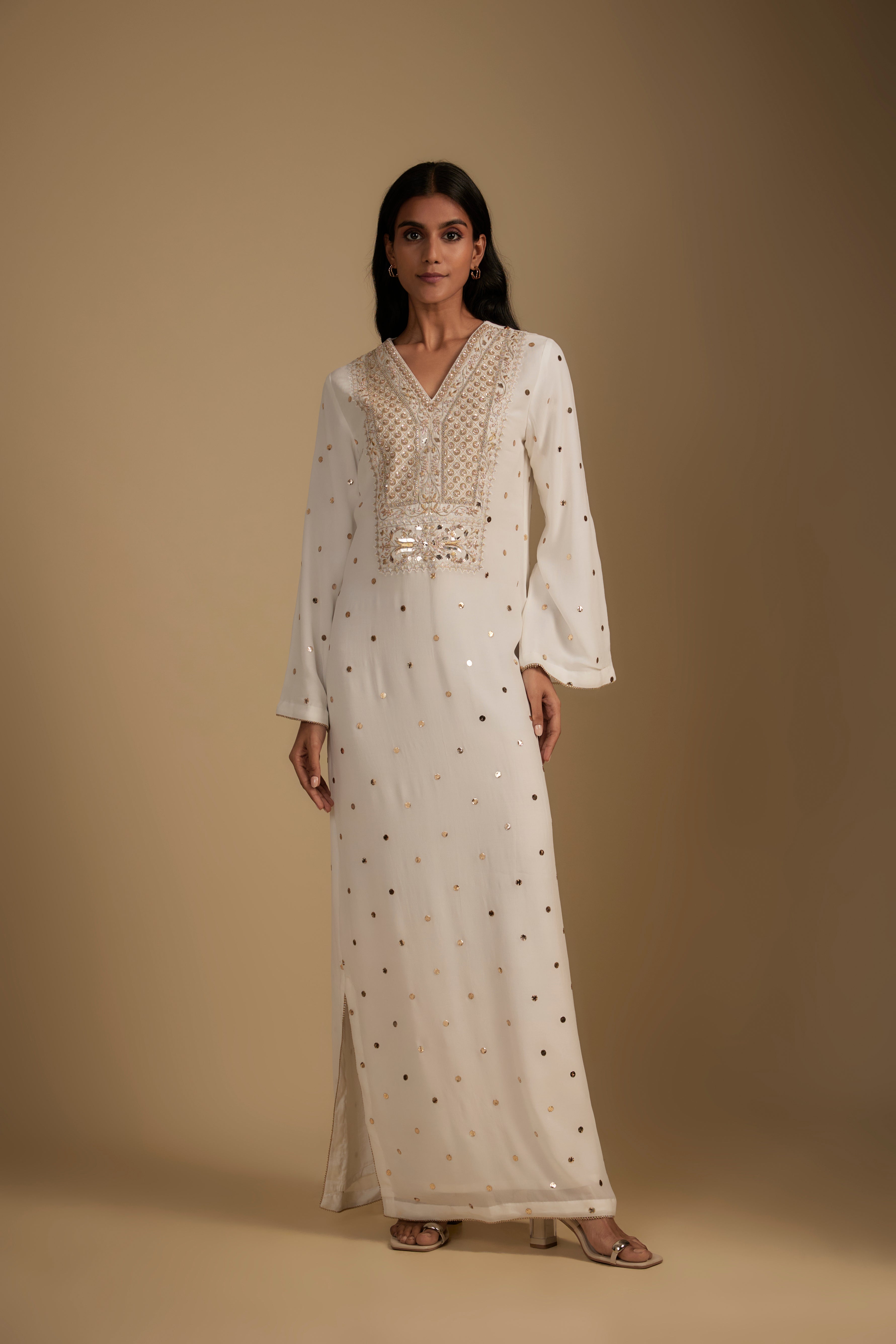 Featuring a white kaftan in georgette base with zardosi and marodi embroidery. Accentuate it with statement jewellery and heels for a festive occasion.