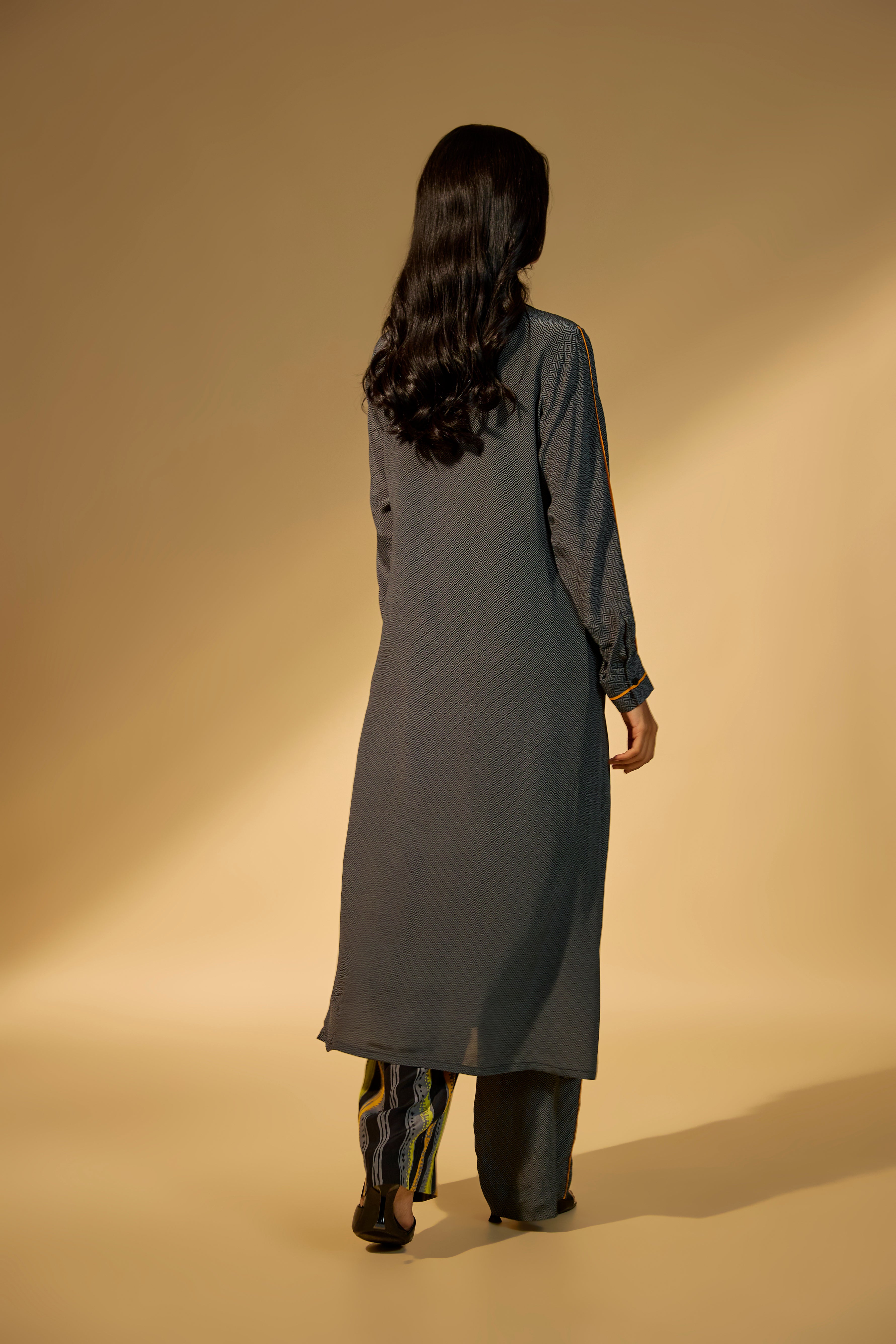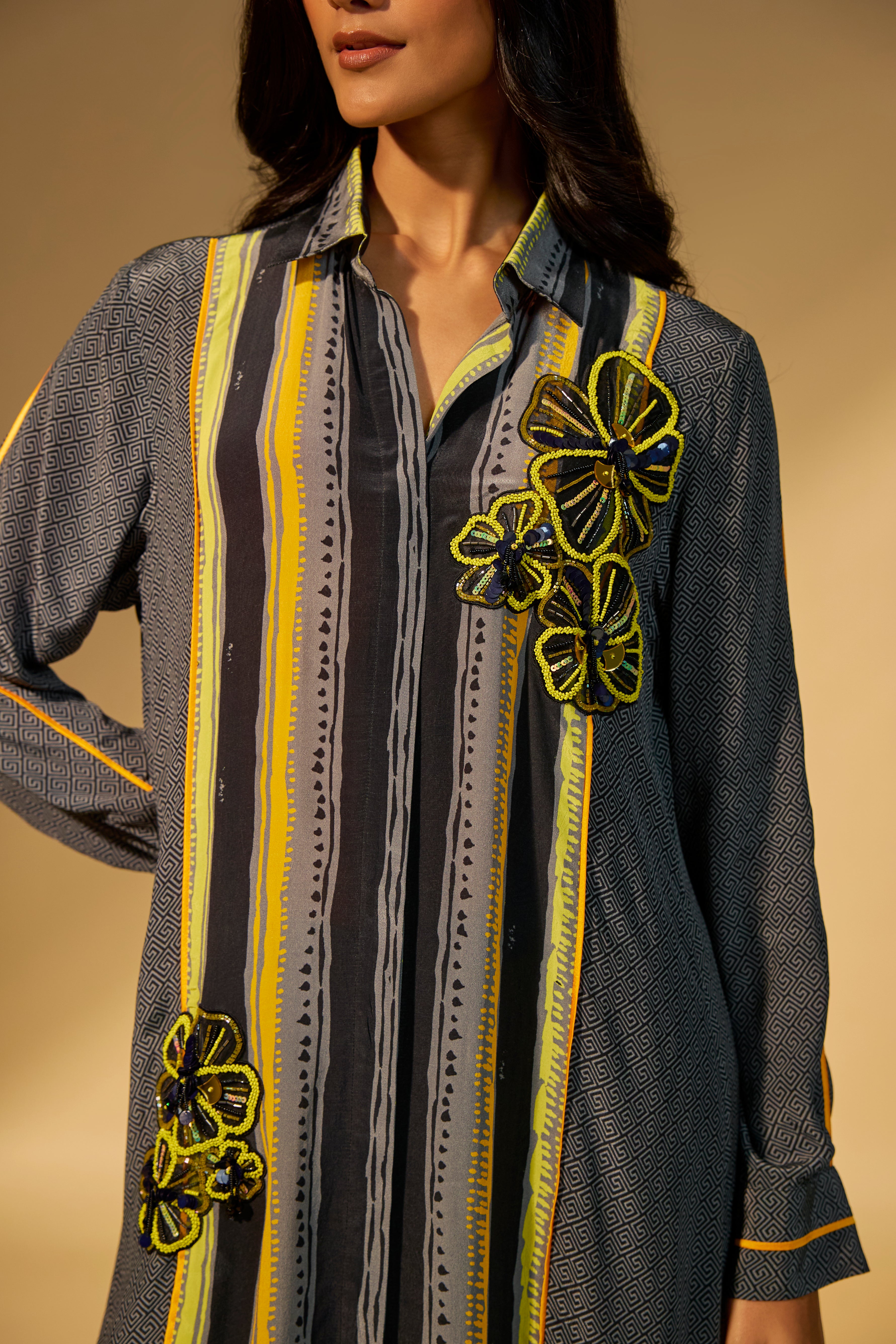 Featuring a yellow-black printed kurta set in crepe fabric with sequins and bead work embroidery.